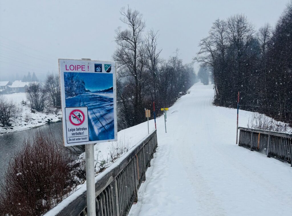Bij goede sneeuwcondities ligt er een loipe langs de rivier de Gail, tussen Kirchbach en Kötschach-Mauthen — op slechts 300 meter van het chalet. De foto geeft dit startpunt weer.